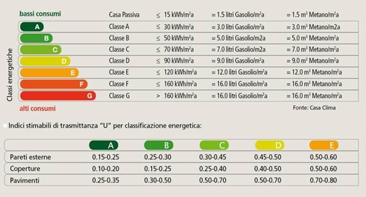 Una casa in classe A, ha un coefficiente di 0,01 al metro cubo, mentre una casa in classe G consuma almeno 0.055kw al metro cubo